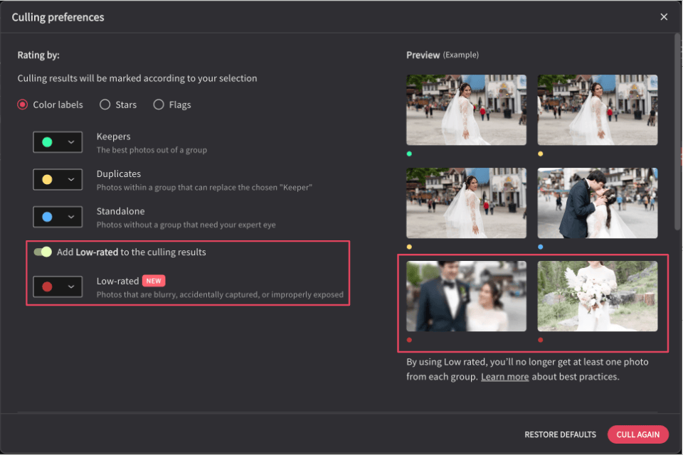 Culling Studio has a new rating category for blurry, accidentally captured, or improperly exposed photos. Add Low-rated to your culling results in the culling preferences to group these types of photos together for quick and efficient review.