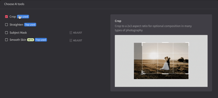 We improved our workflow to make it easier to get the best results in your projects. First, you choose your photos and their file format. Then, you choose your profile and photography type to automatically get a tailored list of AI tools for your project. Also, you'll see a GIF preview of how the AI tool works as soon as you hover over it.